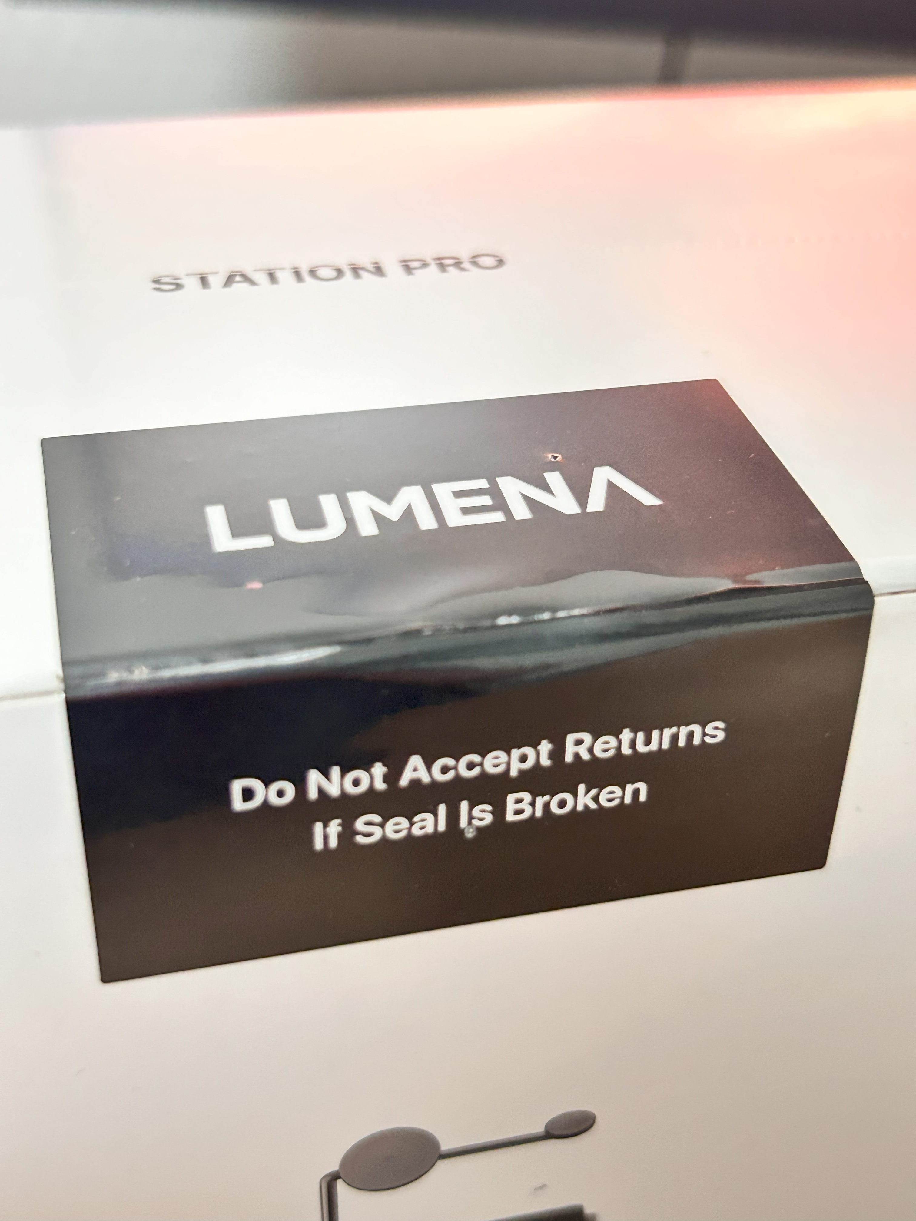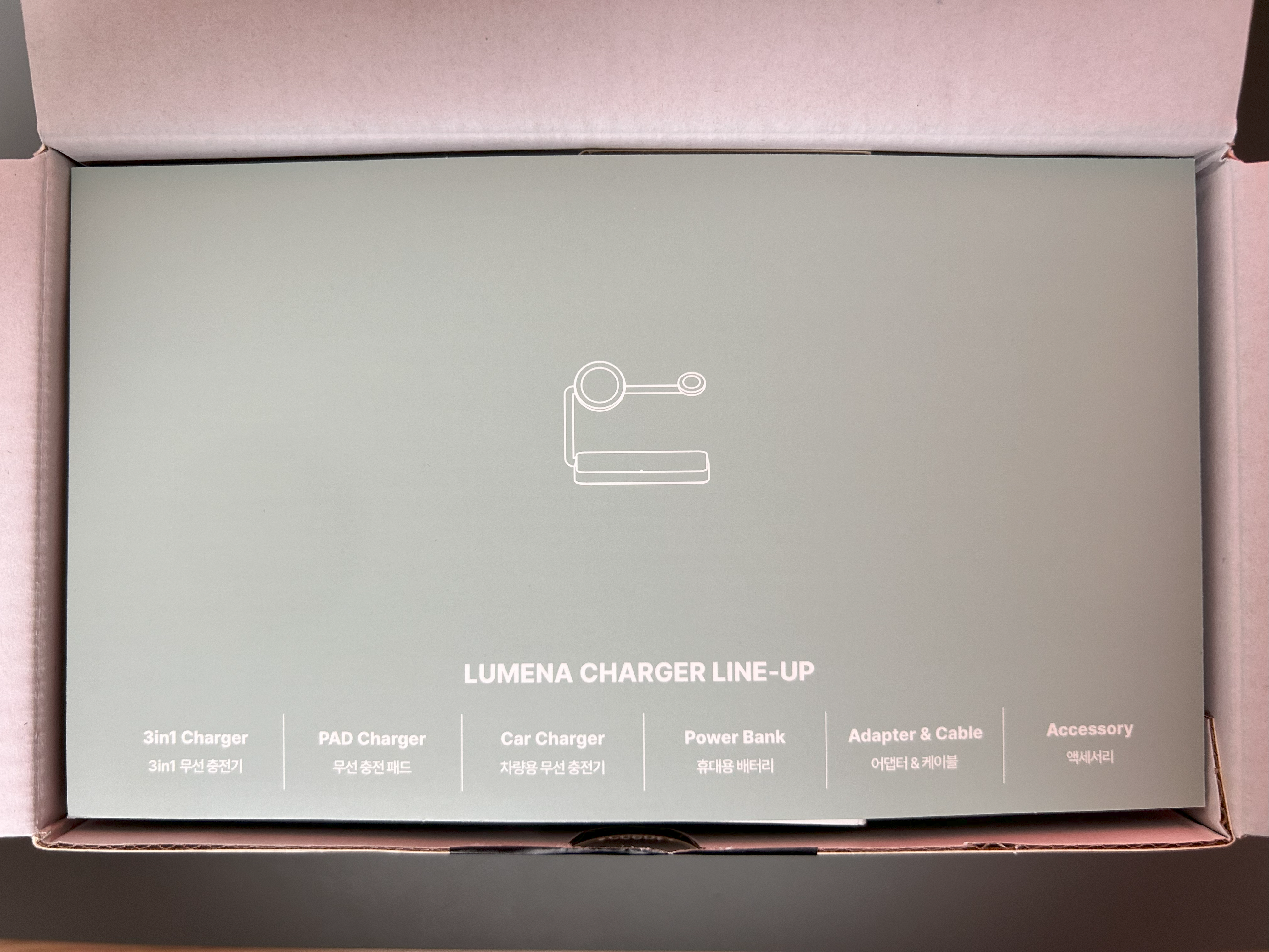 LUMENA 로고가 적힌 박스를 열면 본품과 사은품으로 제공되는 47W 멀티 어댑터가 들어있습니다.
