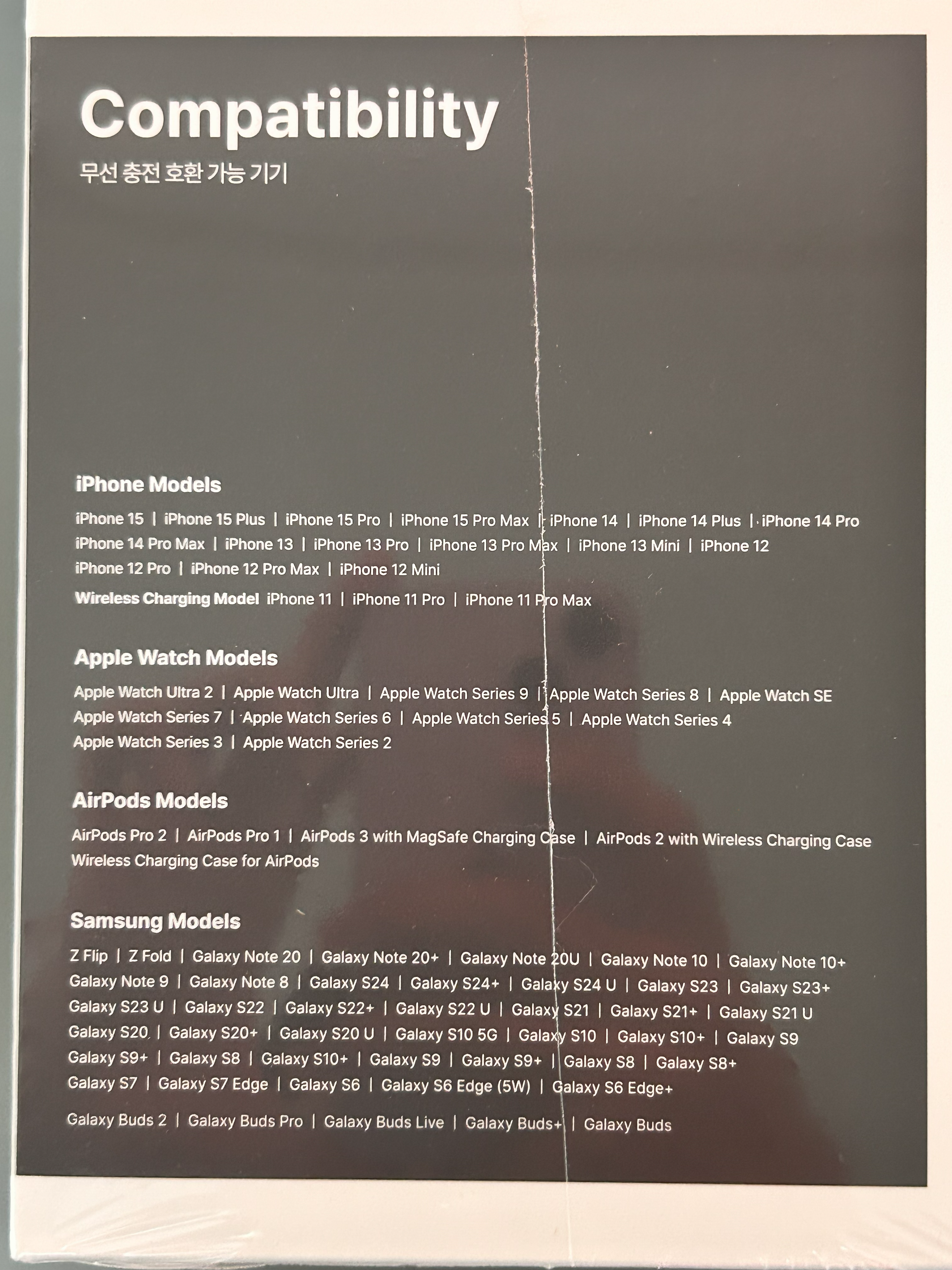 본품 상자를 살펴보면 충전기 사양인 Qi2 인증, 최대 출력 28W, 3가지 기기 동시 충전, 이중 온도 센서를 통한 발열 최소화, 배터리 수명 보호 기능이 적혀 있습니다. 후면을 보시면, 요즘 말이 많았던 KC 인증도 받은 제품입니다. 측면을 보시면 사용 가능한 기기가 적혀 있습니다. Qi2 맥세이프 충전을 하시려면 iOS 17.2 이상인 아이폰 13 시리즈, 14 시리즈와 iOS 17.4 이상인 아이폰 12 시리즈가 필요합니다. 아이폰 15 시리즈는 버전과 관계없이 Qi2를 지원합니다.