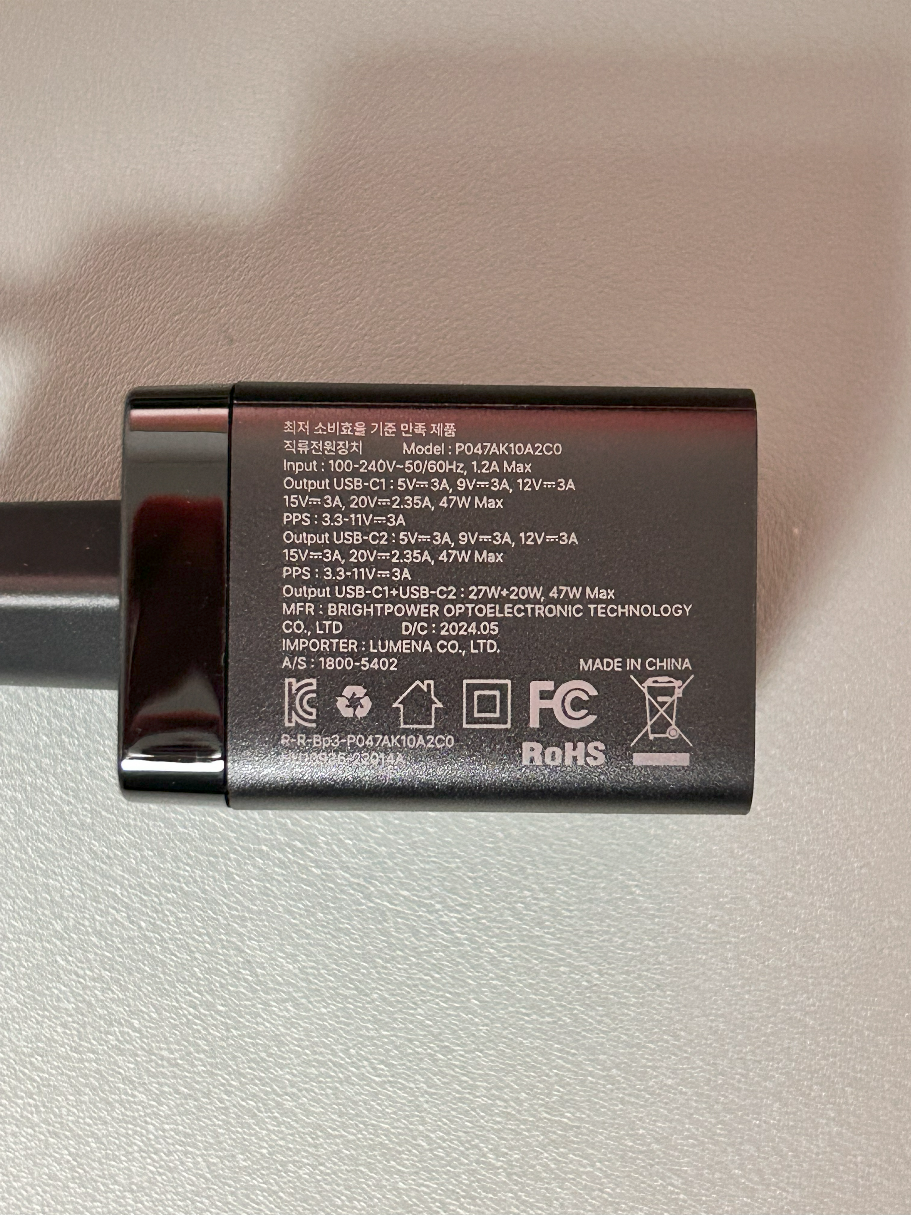 상시 스펙과 멀티 충전기답게 듀얼 C타입입니다. 스펙을 보면 C1 포트와 C2 포트 둘 다 최대 47W까지 출력이 나오는 것을 확인할 수 있습니다.