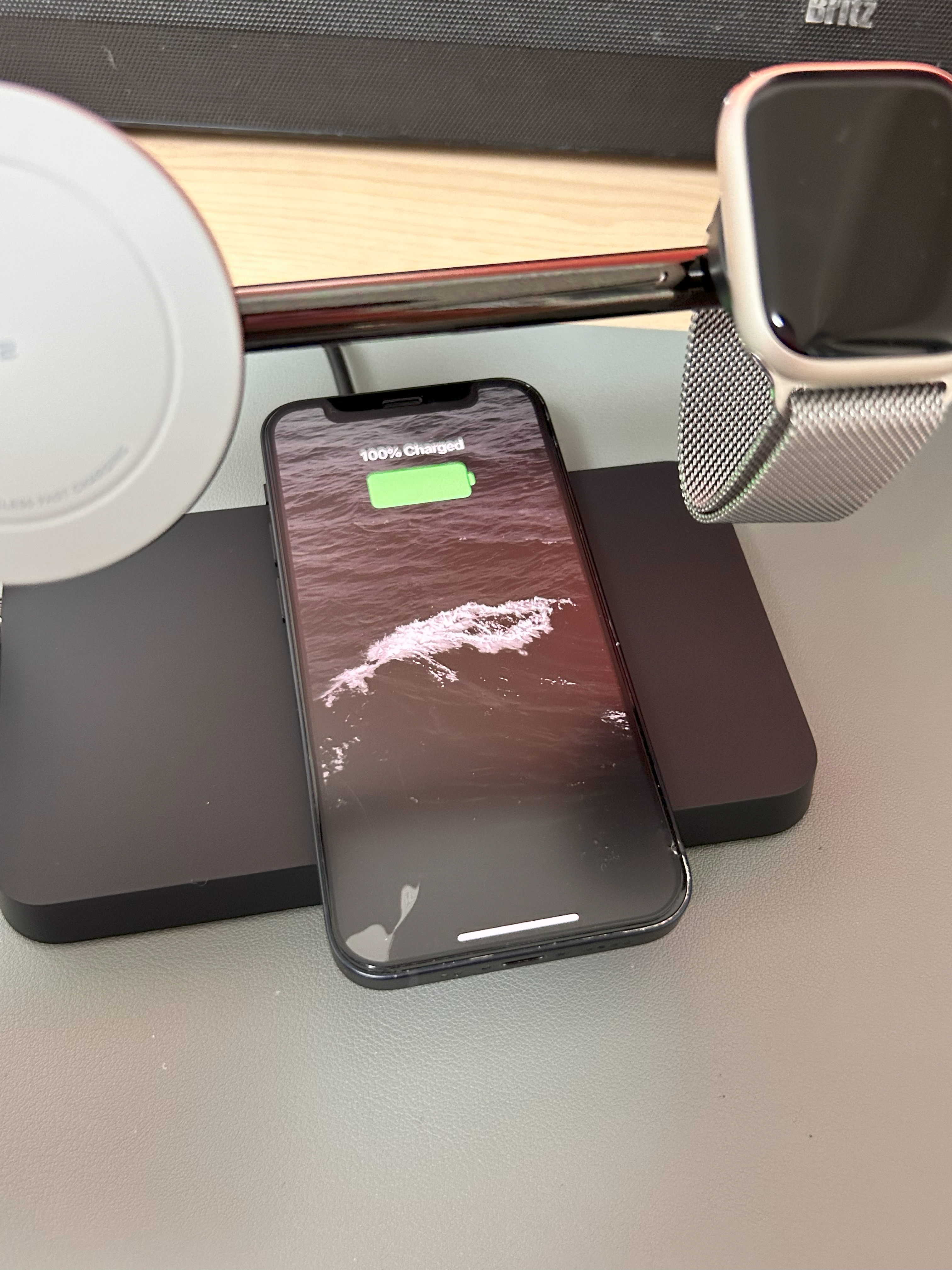아이폰과 애플워치 시리즈 7, 에어팟 프로 2 모두를 동시에 충전해도 맥세이프 고속 충전을 지원하는 모습입니다.