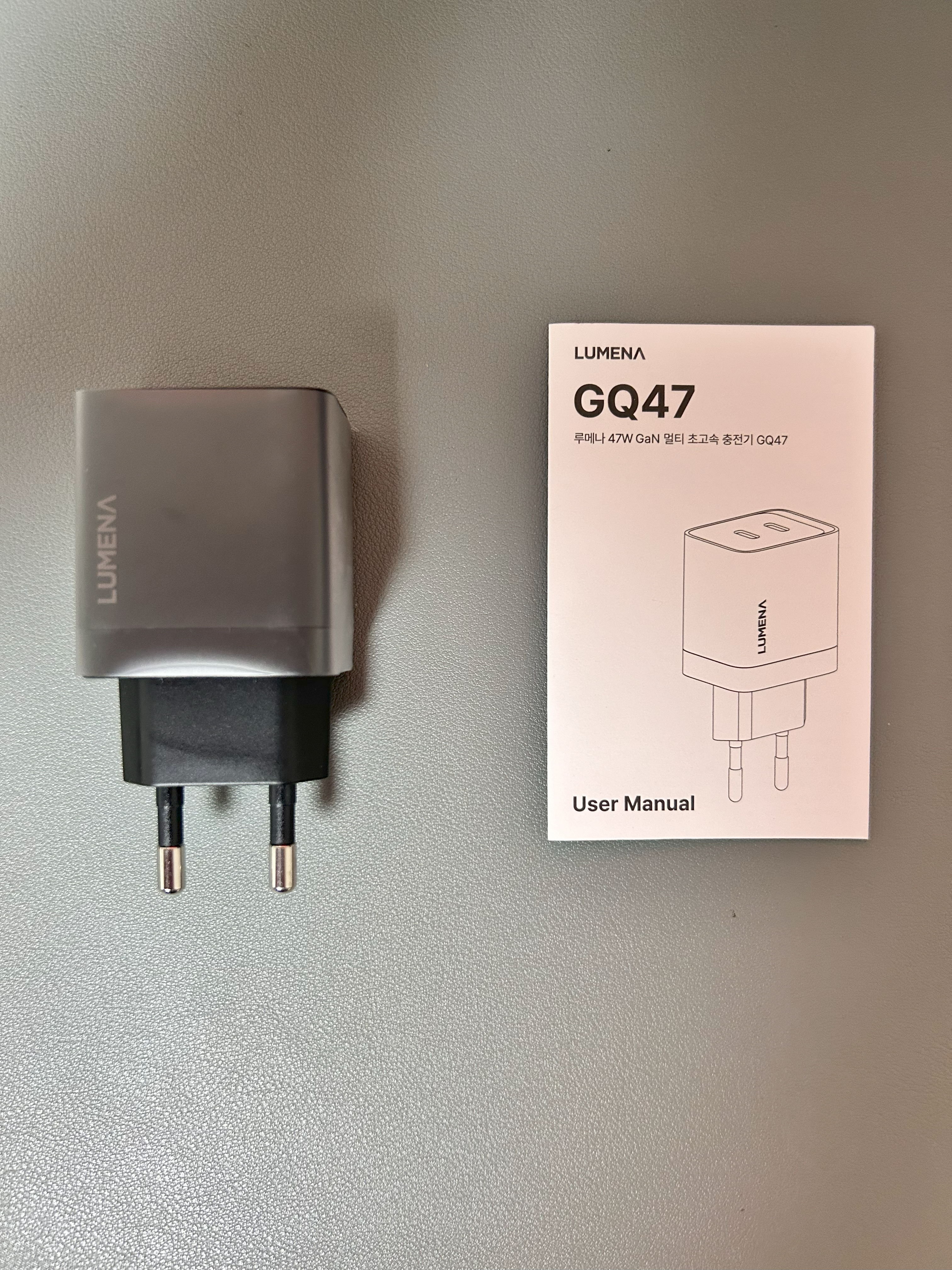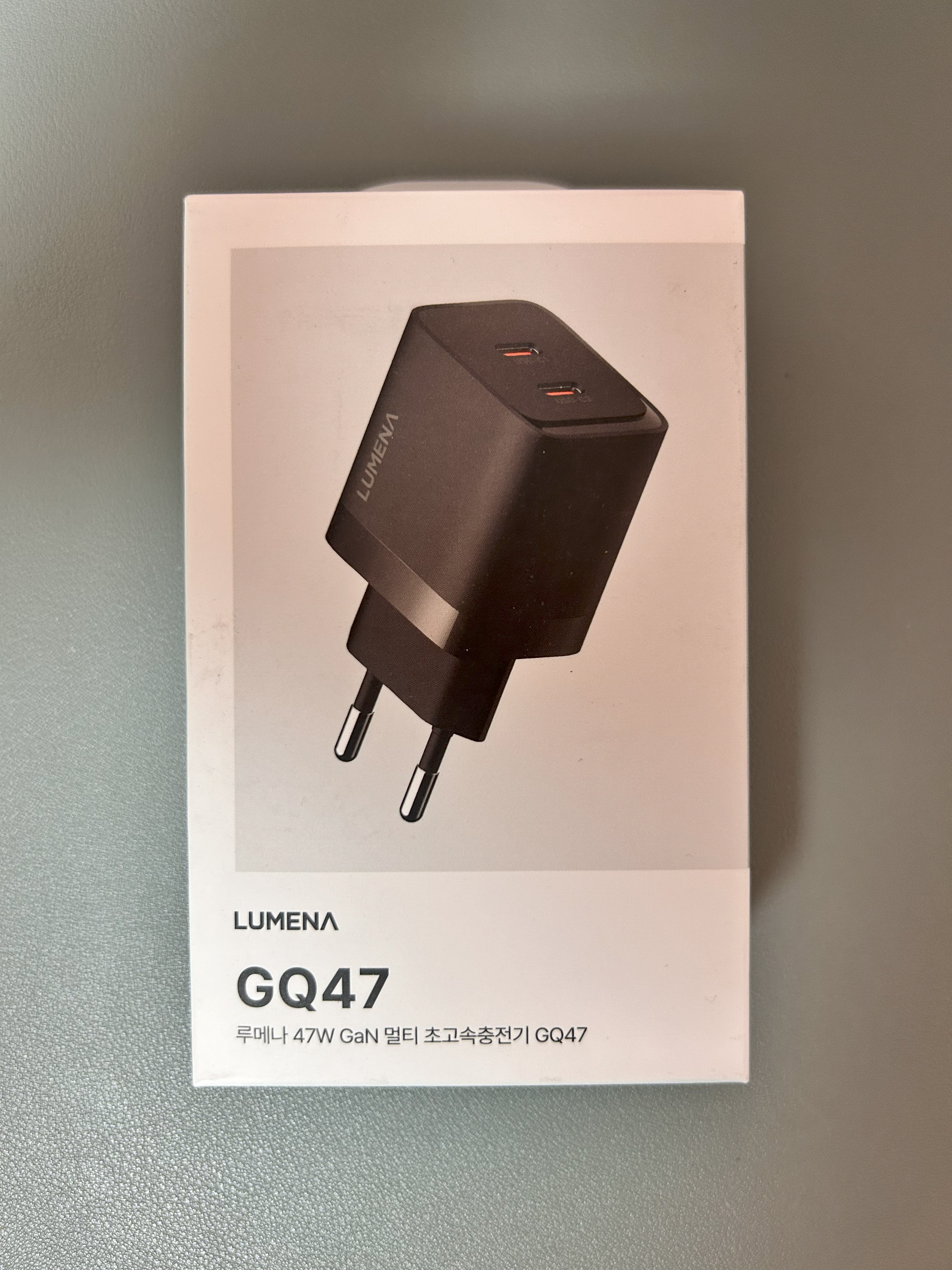 LUMENA-GQ47이라는 47W GaN 멀티 충전기입니다. 봉인 라벨 스티커가 부착되어 있습니다.